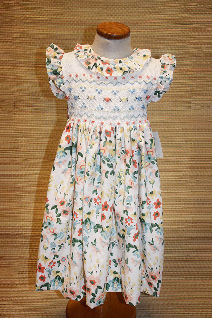 Vestido de poplin estampado con bordado punto smock